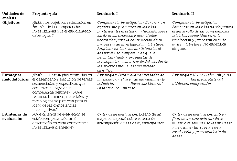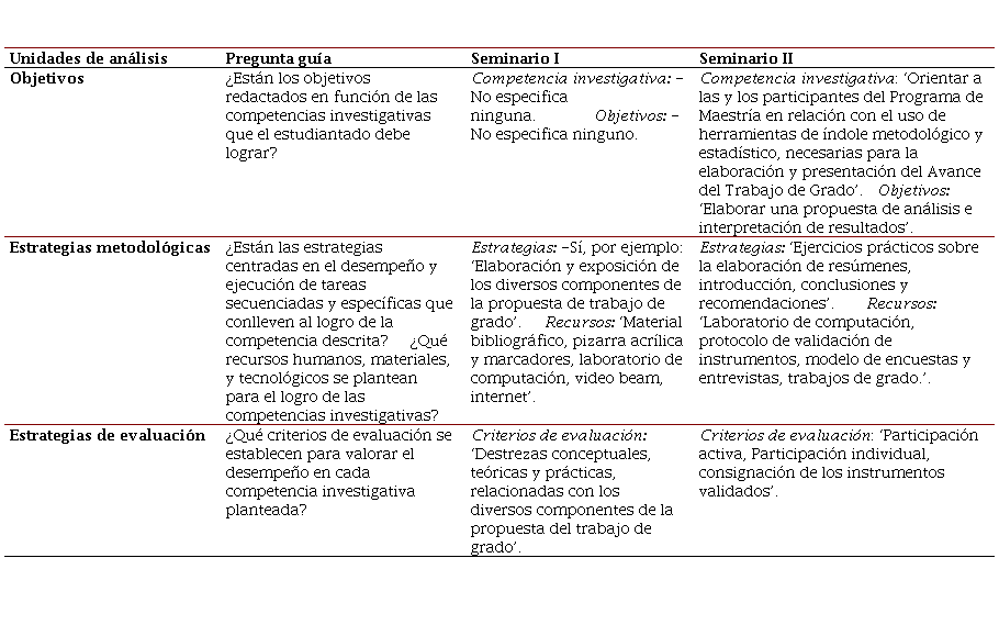Analizar los programas Seminario I y Seminario II en términos de las competencias investigativas que promueven estas asignaturas para la formación de investigadores e investigadoras.