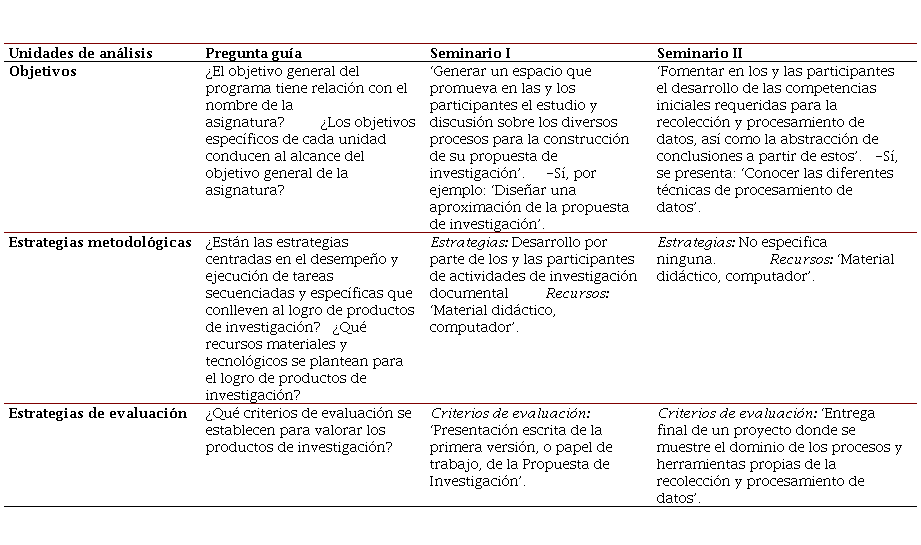 Los programas Seminario I y Seminario II están desvinculados. No se evidenció continuidad entre uno y otro, pese a que fueron elaboradas por la misma persona docente. Es importante destacar que no hay manera de que puedan desarrollarse competencias investigativas con programas de asignatura desactualizados, que escasamente contribuyen al trabajo interdisciplinario. Predominó el individualismo, por lo que no se fortaleció el trabajo colaborativo como oportunidad de aprendizaje y, la perspectiva positivista en la manera como está elaborado cada Seminario, pareciera que no se tomó en cuenta el trabajo colaborativo ni la planificación compartida.