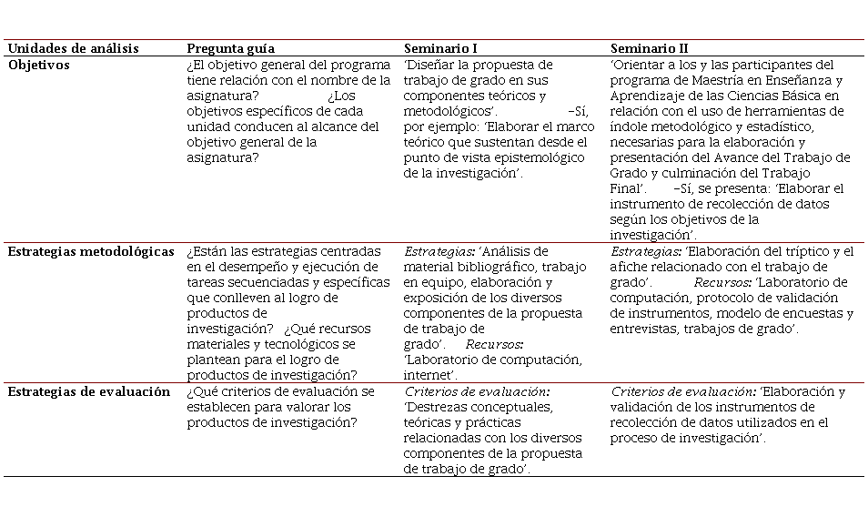 Finalmente, se muestra en la Tabla 6 los resultados del programa Enseñanza y Aprendizaje de las Ciencias Básicas. Se destaca la vinculación entre el objetivo general y los objetivos específicos, por ejemplo, el Seminario I plantea el diseño de la propuesta de trabajo de grado en sus componentes teóricos y metodológicos, esto mediante la elaboración del marco teórico sustentado desde el punto de vista epistemológico. El Seminario II, por su parte, orienta al participante en relación con el uso de herramientas de índole metodológico y estadístico, necesarias para la elaboración y presentación del avance del Trabajo de Grado y culminación del Trabajo Final, a través de la elaboración del instrumento de recolección de datos según los objetivos de la investigación. En otras palabras, centrado en el uso de herramientas de índole metodológico y estadístico, con el propósito de presentar resultados mediante cuadros y gráficos, obtenidos de la aplicación de instrumentos para tales fines. Las estrategias metodológicas se resumen en analizar el material bibliográfico, y en la exposición de los componentes de la propuesta de trabajo de grado en el Seminario I; por su parte, el Seminario II incluye la elaboración de tríptico y el afiche (se refiere a los posters a presentar en conferencias de divulgación científica) relacionado con el trabajo de grado. Con respecto a los recursos para el Seminario I, se menciona el uso de internet como una herramienta de tipo tecnológico; en cuanto al Seminario II, se evidencia el uso del laboratorio de computación. Coincide con otros programas analizados el protocolo de validación de instrumentos, modelo de encuestas y entrevistas, y trabajos de grado. Sin embargo, no se explicitaron los criterios e indicadores para el diseño de estos instrumentos ni su aplicación en el trabajo de campo. La evaluación de los productos de investigación se limita, en el caso del Seminario I, a las destrezas conceptuales, teóricas y prácticas, y para el Seminario II, a la elaboración y validación de los instrumentos de recolección de datos. No se precisa la manera de cómo se abordará la realidad del contexto educativo para resolver problemas de la institución por la vía de la investigación, un producto investigativo.