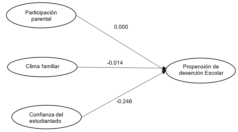 La Figura 1 refleja las asociaciones que hay de manera directa: de forma negativa, la confianza y el clima familiar tienen un peso de -0.246 y -0.014, respectivamente; mientras que la participación de los padres y las madres en los estudios de sus hijas e hijos registró un peso de 0.00, por lo que se establece: