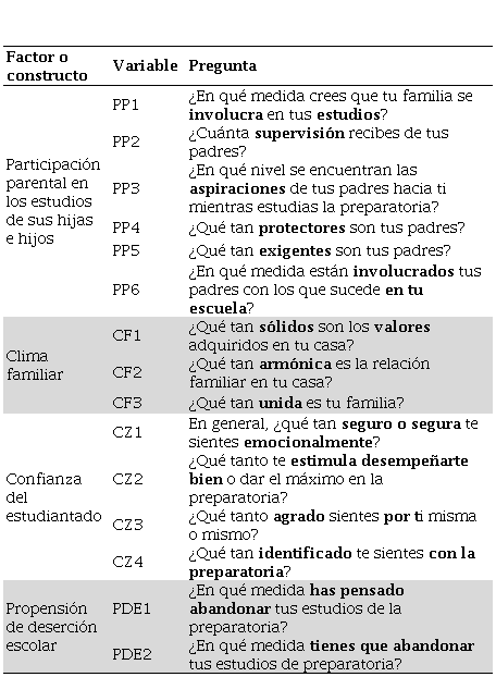 Así, el presente estudio tiene como objetivos: 1) analizar los niveles de los factores participación parental en los estudios de sus hijas e hijos, clima familiar, confianza del estudiantado y propensión de deserción escolar del CBM y 2) asociar los factores participación parental en los estudios de sus hijas e hijos, clima familiar y confianza del estudiantado con la propensión de deserción escolar del CBM. Con dichos propósitos se establece la hipótesis: a mayor participación parental en los estudios, mejor clima familiar, mayor confianza del estudiantado y menor propensión a la deserción escolar del CBM.