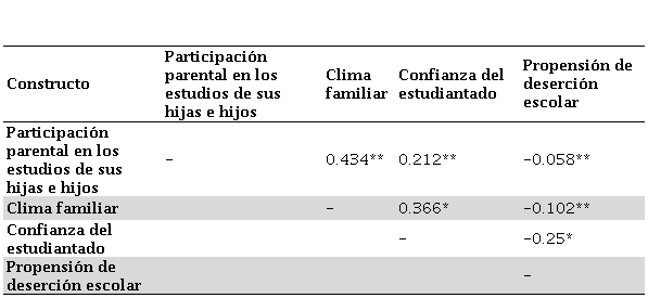 Como se aprecia en la Tabla 2, la media del constructo participación parental en los estudios de sus hijas e hijos fue de 3.87, es decir, las alumnas y los alumnos del CBM consideran que sus mamás y papás se involucran en sus estudios, ejercen supervisión a sus actividades escolares, tienen aspiraciones sobre ellas o ellos, son protectores y protectoras, exigentes, y se involucran en la escuela entre regular y suficiente. En cuanto a tener valores familiares sólidos, relaciones armónicas en el hogar y la unión parental, los resultados promediaron 4.11, entre suficiente y mucho. Para la confianza del estudiantado, las alumnas y los alumnos del CBM estiman que tienen seguridad emocional, dan el máximo en la preparatoria, tienen agrado por sí mismos y mismas, y se identifican con el CBM entre regular y suficiente con una media de 3.76. Finalmente, la propensión de deserción según el estudiantado del CBM es de entre poco y nada con 1.69.