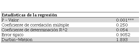 En la Tabla 4 se aprecia que el modelo tiene un nivel explicativo significativo del 5.4% de la varianza (R = 0.054), que con un p - valor < .001 representa el grado de explicación del factor dependiente con respecto a los independientes, o bien, la relación que hay entre las . con la .. Con el valor arrojado, y con base en los muchos y complejos factores que intervienen en la deserción escolar, se puede suponer que el modelo es confiable. Se entiende que la propensión de deserción escolar entre el alumnado activo del CBM aumentará o disminuirá según el clima familiar y la confianza del propio estudiantado, mientras que la β que arroja el modelo empírico para el factor participación parental es de 0, por lo que indica que no influye.