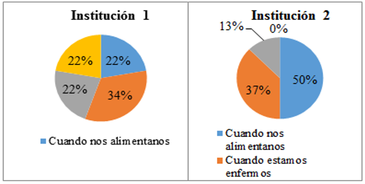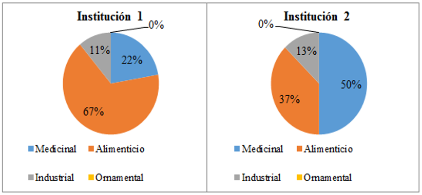De acuerdo con la información proporcionada por la Figura 1, Cuellar et al. (2018) menciona que es importante resaltar que la población de la institución 1 posee más un entendimiento acerca de los usos de las plantas para enfermedades, mientras que la población evaluada en la institución 2 evidencia el uso como alimento.