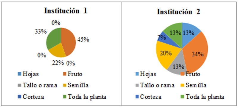 Según la Figura 3, dentro de las partes más utilizadas por la población encuestada, es notable que se aprovecha más el fruto y las semillas de las plantas; sin embargo, es importante tener en cuenta que se podrían implementar usos alternativos para las partes restantes de las plantas en mención; tales como la fabricación de nuevos materiales u otro tipo de uso. Lo cual apoyaría la innovación en la educación primaria.