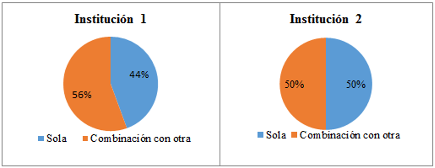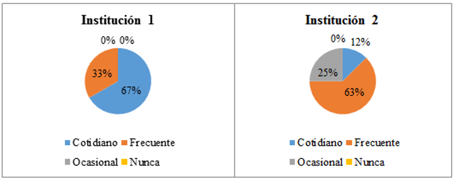 En la Figura 6 “se observa que en los dos contextos el uso de las especies vegetales está presente, en la institución 1 de manera cotidiana y en la institución 2 es frecuente recurrir al uso de las plantas” (Cuellar et al, 2018, p. 66).