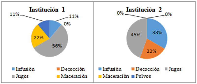 las dos instituciones refieren los jugos como preparación principal, vinculada directamente con el aspecto alimenticio y la infusión relacionada al uso de tipo medicinal. La cultura de la institución refleja el uso de concepto en cuanto al procedimiento de maceración (Cuellar et al., 2018, p. 64).
