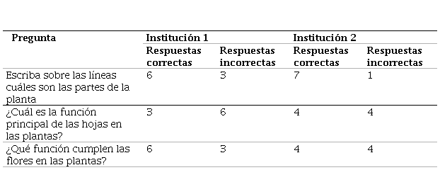 Para la aplicación del test, el instrumento fue dirigido a 9 estudiantes en la institución 1, y 8 estudiantes en la institución 2. En la primera sección, conformada por 3 preguntas, se busca determinar el conocimiento previo con el que cuenta el estudiantado con respecto a la anatomía y función que cumplen las plantas; se obtuvieron los siguientes resultados:
