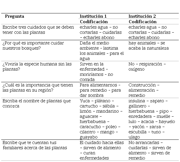 En cuanto al cuidado de ecosistemas, se puede observar que los resultados obtenidos se relacionan con los efectos del mal uso de las plantas y ecosistemas, y el impacto a otros seres vivos y procesos bióticos; dentro de las respuestas se puede encontrar: dañar los animales y para que haya agua. Se detalla sentido de pertenencia en el medio que le rodea: dentro de los conocimientos de la población se encuentra un no contundente al plantear la existencia del ser humano sin plantas, “la institución 1 conoce acerca de la relación de las plantas con los alimentos; mientras que la institución 2 ve su importancia en otro proceso biológico, como es la producción de oxígeno y la respiración.” (Cuellar et al., 2018, p. 64).