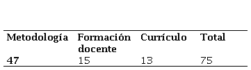 De las 92 fuentes consultadas para elaborar este documento, se utilizaron 75 para desarrollar las tres categorías de análisis. Si bien, más de la mitad de las investigaciones (57 %) tratan la temática de la metodología, frente al 15 % que versan sobre el currículo y el 18 % sobre la formación docente; cabe resaltar que varias fuentes se utilizaron para enriquecer más de una categoría.
