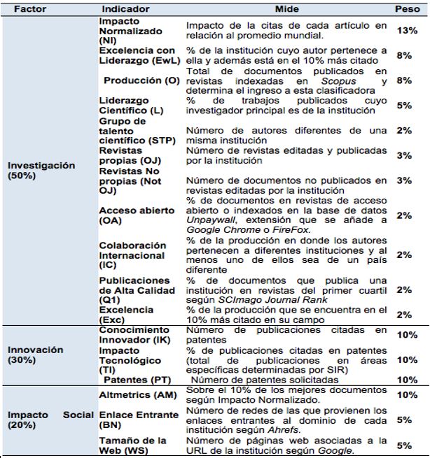 La producción de investigaciones por las universidades ha ido en aumento, y con ello la necesidad de mecanismos de medición y visibilidad, los que utilizan indicadores en materia de investigación que sirven para establecer los rankings. Entre los más respetados están SCImago Institutions Ranking (SIR) y Ranking Web de Universidades (Webometrics). Cada uno de esos rankings utiliza diferentes parámetros; SCImago Institutions Ranking (SIR) emplea en su metodología 17 indicadores agrupados en tres factores: investigación, innovación e impacto social (Ver Figura 1); desde el año 2009 publica dos informes anuales por medio de SCImago Research Group: SIR World y SIR Iber.