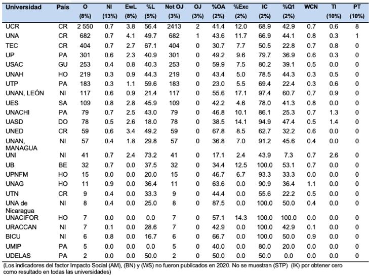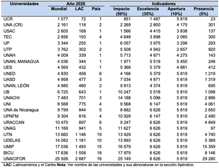 A nivel mundial, y latinoamericano y del Caribe, las primeras diez posiciones son ocupadas por UCR, UNA, USAC, TEC, UP, UTP, UNAH, UNAN-Managua, UES y UNED, respectivamente. Asimismo, estas diez universidades ocuparon el primer o segundo puesto en su respectivo país, a excepción de TEC, que ocupó el cuarto y UNED el sexto lugar.