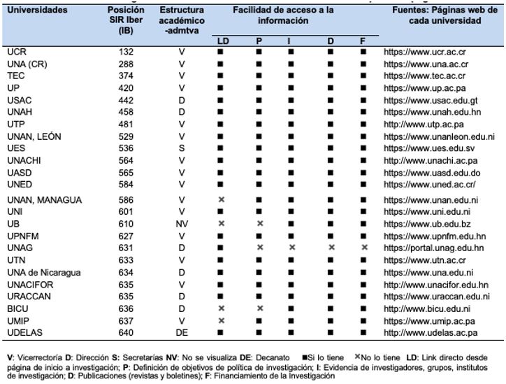 Se efectuó, además, un análisis de cada página web de las universidades analizadas para determinar, por un lado, la estructura académico-administrativa de la investigación y, por otro lado, la facilidad de acceso a la información sobre investigación científica; se identificaron 5 indicadores: a) link directo desde la página de inicio de la investigación, b) definición de objetivos de política de investigación; c) evidencia de personas investigadoras, grupos e institutos de investigación; d) publicaciones (revistas y boletines), y e) financiamiento de la investigación; estos con base en el estudio de Mejía et. al. (2016), quienes consideran que las páginas web de las universidades se han constituido en un indicador de calidad en diferentes rankings.