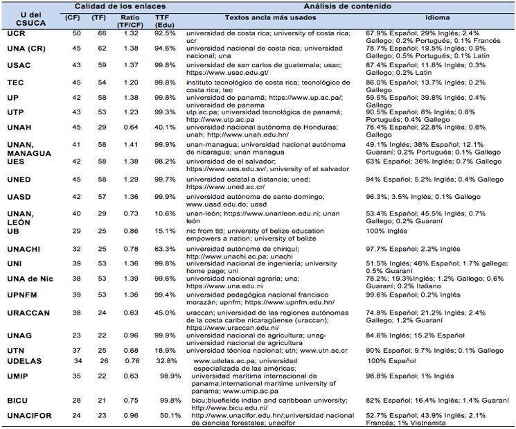 Las universidades del CSUCA presentan diferentes textos-ancla, la mayoría referidos al nombre de la institución o a la URL de la página web respectiva. Esta variabilidad refuerza la autenticidad de sus respectivas páginas. En cuanto al idioma detectado del público lector que entra a la página de cada universidad, se observa que presenta variabilidad de idiomas, a excepción de UDELAS que presenta 100 % en español y UB con 100 % en inglés.
