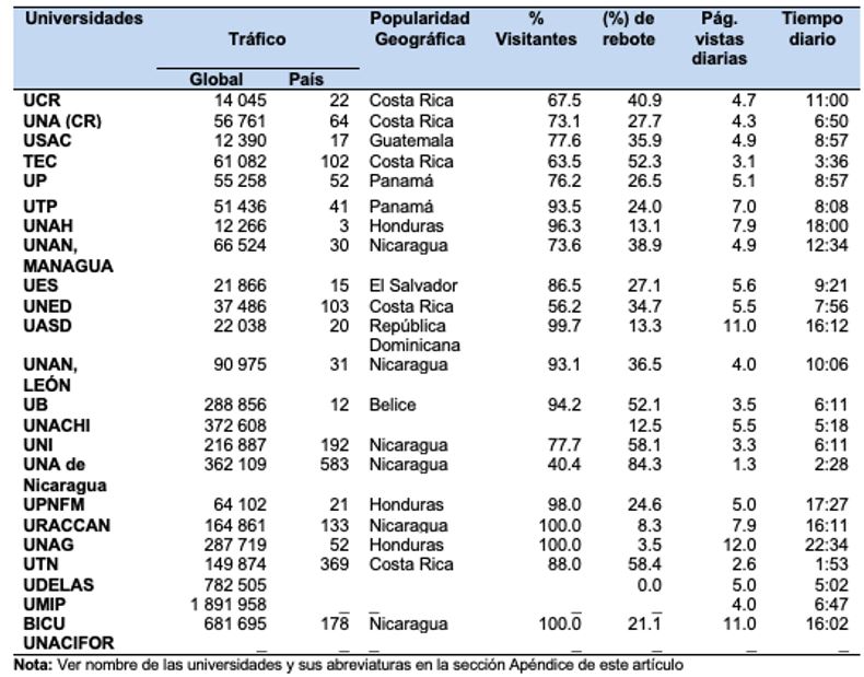 En el tráfico en su respectivo país, la UNAH ocupa el tercer puesto en el sitio más buscado en Honduras, mientras que en Belice, la UB ocupa el puesto 12 y en El Salvador UES logra el 15. En los países donde están las universidades analizadas (se excluye Belice por presentar datos insuficientes en Rank de Alexa), tienen como sitio más popular a Google.com®, seguido de Youtube.com®; el tercer puesto es ocupado por noticieros y redes sociales a excepción de Costa Rica, que tiene en segundo lugar a Crhoy.com® –noticiero del país–, y a Honduras, que tiene como tercero la página web de la UNAH, el cual obtiene principalmente –con 63.2 %– de la redirección de la búsqueda de “campus virtual UNAH”.