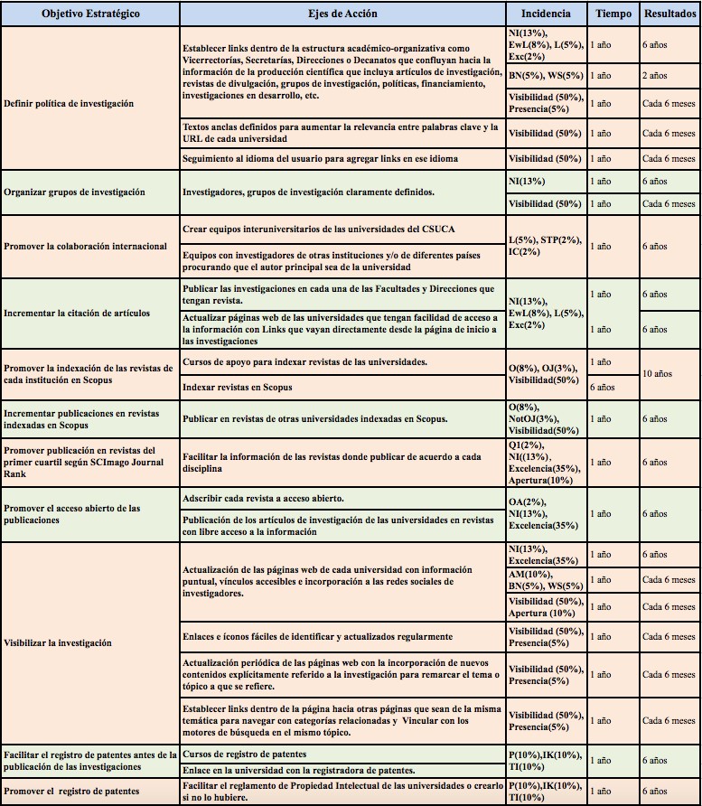En la Figura 7 se presentan sugerencias de estrategias para incidir sobre los indicadores que estas clasificadoras utilizan, para que las universidades puedan potenciar su calificación en investigación. En la primera y segunda columna están los objetivos estratégicos y sus respectivos ejes de acción, en la tercera columna, el tiempo que tomaría su implementación, y, en la última columna, el tiempo en que se verían los resultados. Se maximizarán los esfuerzos que las universidades hagan para implementar dichas estrategias, pues ellas estarán incidiendo tanto sobre indicadores SIR como Webometrics.