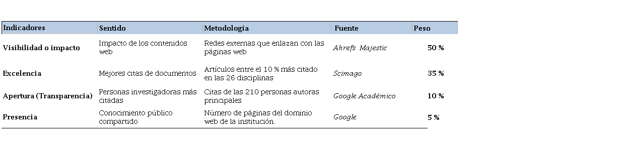 Por su parte, Ranking Web de Universidades (Webometrics) realiza un análisis cuantitativo de la generación del conocimiento científico contenido en la red de Instituciones de Educación Superior (IES), y lo publica desde 2008. La metodología utilizada por esta clasificadora puede verse en la Tabla 1 (Ranking Web de Universidades, 2020).