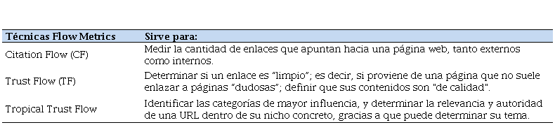 Citation Flow (CF) utiliza puntuación numérica por cada página de internet −de escala logarítmica− que es transformada en un valor de 0 a 100. En Trust Flow (TF), los sitios confiables, como los de las universidades, suelen estar enlazados con páginas de confianza hasta que llega un punto en el cual la confianza llega a disminuir (Marcilla, 2019).