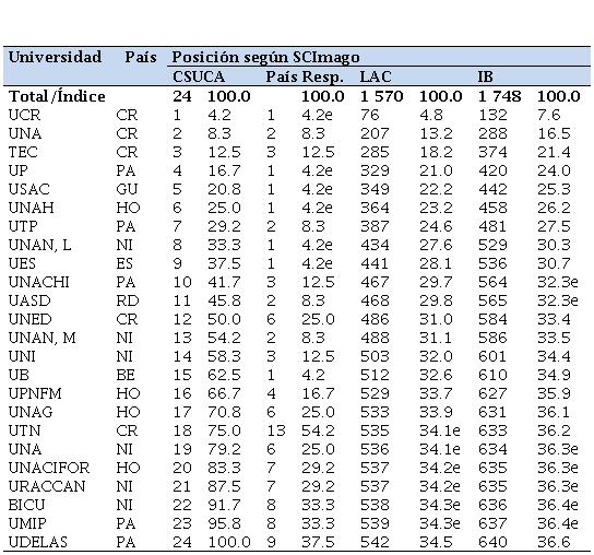 La clasificación absoluta permite diferenciar las posiciones alcanzadas por estas universidades según SCImago; mientras que la clasificación relativa permite comparaciones, dado que el número de universidades analizadas difiere en cada contexto; así, por ejemplo, el total de las universidades del CSUCA es 24, las latinoamericanas y del Caribe son 1,570 y las iberoamericanas son 1,748. Para realizar comparaciones válidas y neutralizar el mencionado efecto, se presentan con indexación de cada total a 100, donde ocupan una mejor posición en la medida que el indicador sea menor.