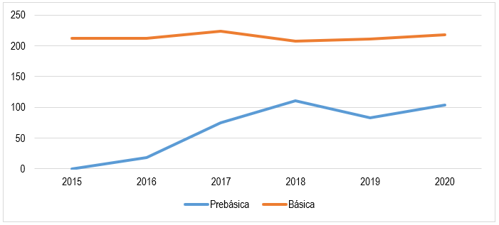 En cuanto a la matrícula, se levantaron y analizaron las estadísticas educativas del periodo de 2015 a 2020, recolectadas a través de las boletas estadísticas de matrícula final que presentan la dirección de los centros educativos al finalizar el mes de noviembre de cada año, y fueron solicitadas de manera directa a los mismos directores para este estudio. Los datos muestran que ha aumentado la matrícula en el nivel de educación prebásica (preprimaria), donde el CNB establece el inicio del desarrollo de la LEI. En el caso del nivel básico, no se observa un crecimiento ni decrecimiento, pero sí ha existido un comportamiento sostenido en cuanto a la matrícula del estudiantado.