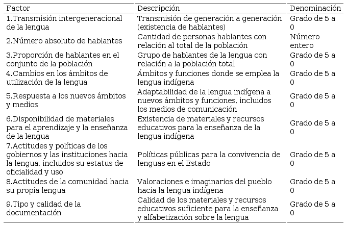 Asimismo, debido a la importancia que tiene la preservación y conservación de las lenguas, la UNESCO (2003) estableció la evaluación para determinar el grado de vitalidad de las lenguas y la urgencia del trabajo de documentación. La evaluación está compuesta por nueve factores, la mayoría (8 de 9) poseen una escala, según distintos condicionantes y por el grado donde cada lengua se posiciona, de acuerdo con los resultados del análisis (ver Tabla 1).