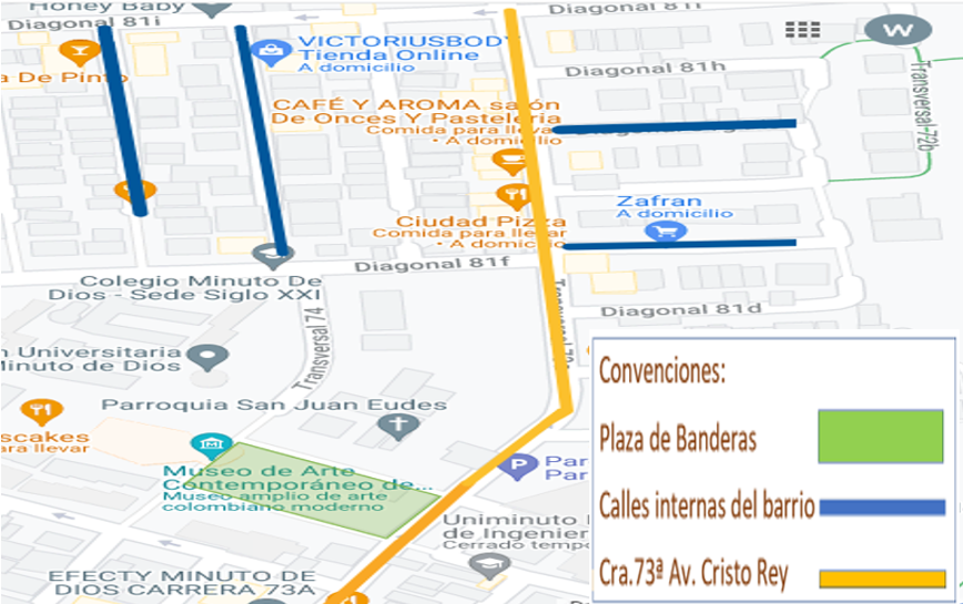 Para evidenciar los cambios ejecutados sobre la infraestructura original del barrio se conformó un archivo integrado por fotografías que retratan la historia del barrio (archivo que pertenece a la Corporación Minuto de Dios) y fotografías tomadas por el autor del artículo en el espacio público del barrio en la actualidad. Los lugares seleccionados fueron la Avenida Cristo Rey (Carrera 73ª), la Plaza de Banderas, el entorno de la universidad y algunas calles secundarias del barrio que permiten otras lecturas desde lo que sugiere la pedagogía urbana, pues, de acuerdo con los registros históricos del barrio, estos lugares resultan relevantes desde un punto de vista histórico y comunitario para nuevas enseñanzas y aprendizajes.