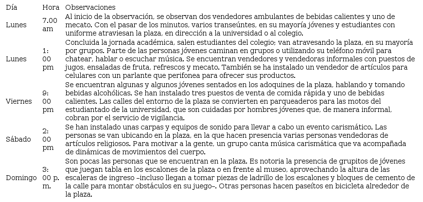 Una muestra de los registros en las fichas de observación llevada a cabo en la Plaza de Banderas se presenta a continuación en la Tabla 1: