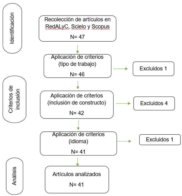Las búsquedas bibliográficas dieron como resultado 50 publicaciones. Después de realizar los criterios de inclusión y exclusión fueron seleccionados 41 artículos, los cuales cumplieron con lo necesario para la elaboración de la revisión. Los principales criterios de exclusión artículos a partir del 2015, trabajos como capítulos de libros, que no se especificara como constructo satisfacción estudiantil, revisiones, tesis y artículos en otro idioma (Moreno et al., 2018).