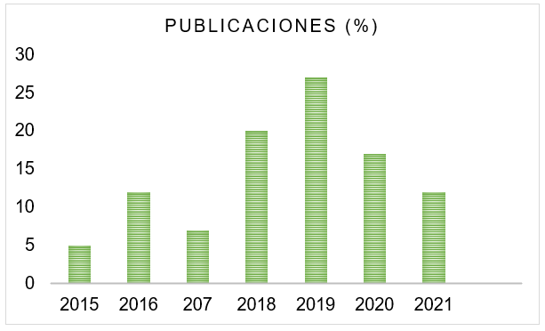 Todos los estudios incluidos en esta revisión utilizaron satisfacción estudiantil como concepto. De acuerdo con el análisis realizado el año 2019 fue el que presentó mayor productividad académica en cuanto a la satisfacción estudiantil, ya que desde el año 2015 la productividad fue aumentando; sin embargo, en los últimos dos años ha disminuido el rendimiento académico en esta área, como se puede observar en la Tabla 1 y Figura 3.