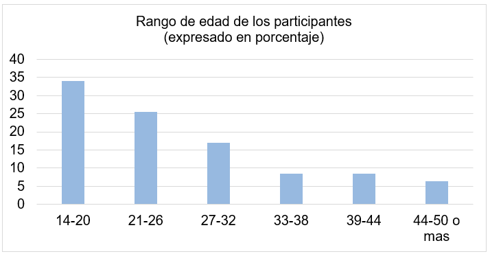 En relación al rango de edad de las y los estudiantes que participaron en los trabajos, se puede observar una mayor participación en la población de 14 a 20 años, y el menor porcentaje en los participantes de 44 a 50 años o más (Figura 4), esto se puede deber a que a estas edades las personas generalmente se encuentran trabajando y estudiando al mismo tiempo, por lo tanto la cantidad de alumnado de dicha edad es mejor así como la disponibilidad de tiempo para realizar actividades extraescolares como la participación en estudios.