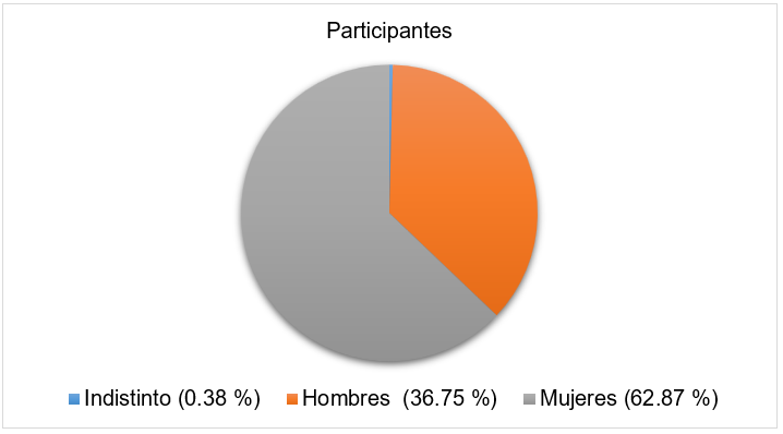 Finalmente, en cuanto al sexo de las y los participantes, el mayor porcentaje corresponde al sexo femenino (62.87 %), posteriormente sexo masculino (36.75 %) y el 0.38 % mencionaron no sentirse identificados dentro de masculino y femenino (Figura 5). Estos resultados arrojan datos interesantes en cuanto a la perspectiva social y educativa que existe en la actualidad; ya que las mujeres muestran un mayor grado de participación en el llenado de encuestas o test de programas de investigación; sin embargo, en los resultados arrojados indican una mayor participación social de los hombres (Rivera-Heredia et al., 2017) así como un mayor grado de motivación por parte de los docentes.