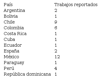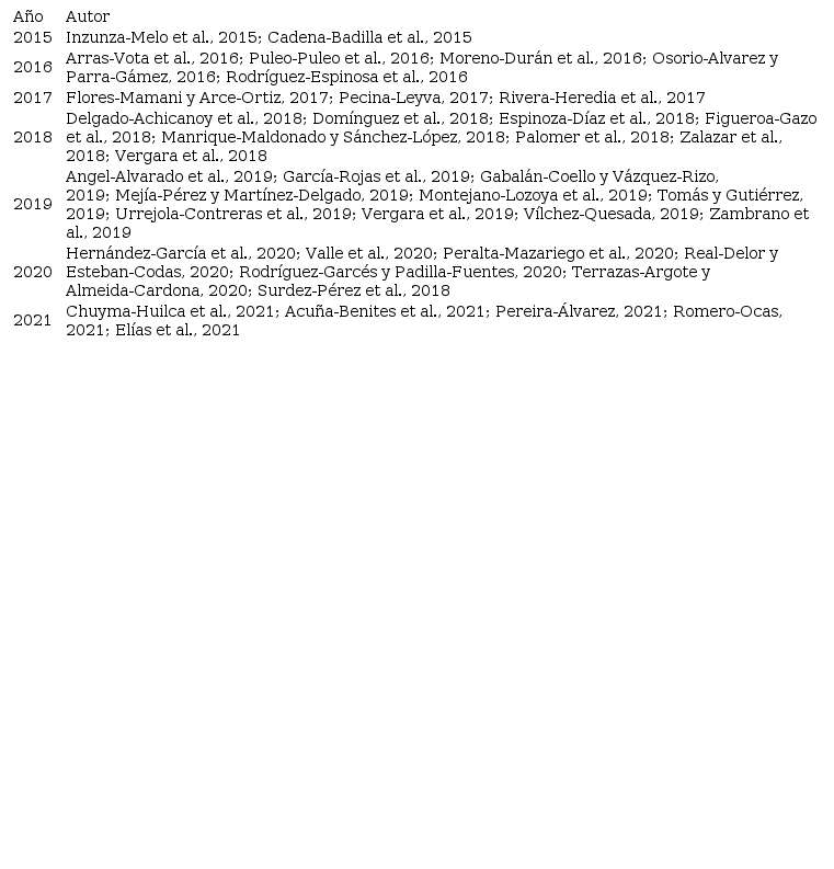 En base a país de origen, el mayor porcentaje (95 %) de los artículos pertenecen al continente americano repartidos en Argentina (5 %), Bolivia (2 %), Chile (22 %), Colombia (15 %), Costa Rica (2 %), Cuba (2 %), Ecuador (2 %), México (29 %), Paraguay (2 %), Perú (10 %) y finalmente República Dominicana (2 %); y el 5 % restante al contienen europeo con trabajos reportados en España (Tabla 2), esto debido a que la búsqueda de artículos se realizó como criterio de inclusión el idioma español.