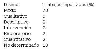 A continuación, se enlistan los porcentajes en cuanto al tipo de estudio realizado; el 76 % de la literatura revisada corresponde a enfoque de estudio mixto, seguido de estudio cualitativo (5 %), descriptivo (2 %), intervención (2 %), exploratorio (2 %), cuantitativo (2 %) y el 10 % restante no especifico el tipo de estudio realizado (Tabla 4).