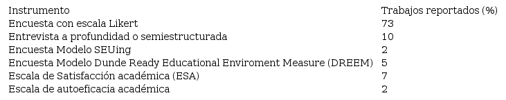 Finalmente, de los 41 artículos revisados el 73 % utilizó una encuesta con escala Likert para conocer el nivel de satisfacción estudiantil, un 10 % de los trabajos se basaron en entrevistas a profundidad o semiestructuradas. La escasa de satisfacción académica (ESA) fue utilizada en un 7 %, el instrumento Dunde Ready Educational Enviroment Measure (DREEM) fue reportada en 5 % de los trabajos. El 2 % menciona la utilización de escalas de autoeficacia académica como instrumento para conocer la satisfacción estudiantil al igual que la encuesta Modelo SEUing (Tabla 6).