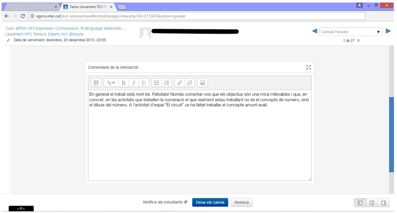 En cuanto a la modalidad, se constató que el espacio que se utiliza para ofrecer feedback por medio de una Wiki con la vía comunicativa netamente escrita. Los feedback consistieron en marcaciones realizadas en el texto con el uso de herramientas de edición de la Wiki, que iban acompañadas en algunas ocasiones de comentarios con orientaciones de mejora mediante la herramienta espacio de discusión. El destinatario fue el alumnado individualmente.