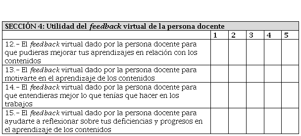 El cuestionario constaba de cuatro secciones y cada una de ellas evaluaba diferentes aspectos del feedback virtual entregado por el profesorado (Anexo 1 y Anexo 2).