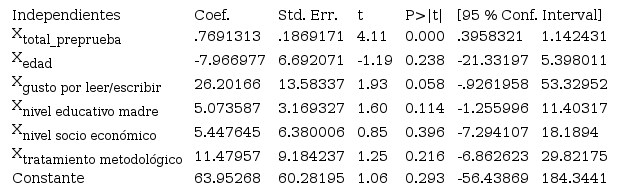Y puntuación subprueba ELGI = βo + β1 Xtotal_preprueba + β2 Xedad + β3 Xgustopor leer/escribir + β4 Xniveleducativo madre + β5 Xnivelsocioeconómico + β6 Xtratamientometodológico