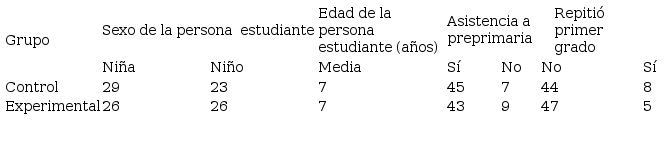 En cada sección de primero primaria participante en el estudio, se seleccionó una muestra de seis estudiantes mediante un muestreo aleatorio sistemático. De manera que la muestra inicial de estudiantes, quienes realizaron la preprueba, estuvo formada por 120 (60 del grupo control del método silábico y 60 del experimental del método fonológico comprensivo) estudiantes de ambos sexos, comprendidos entre las edades de 6 y 11 años. Como se muestra en la Tabla1, la muestra final fue de 104 estudiantes, 55 niñas y 49 niños; 13 indicaron haber repetido este grado. En marzo de 2016 se realizó un cambio de docente en un grupo experimental y la persona docente que asumió el puesto no aceptó participar en el estudio. Junto con este grupo se perdió el control, por lo que la escuela fue excluida del estudio; sumado a cuatro estudiantes de otros centros que se retiraron.