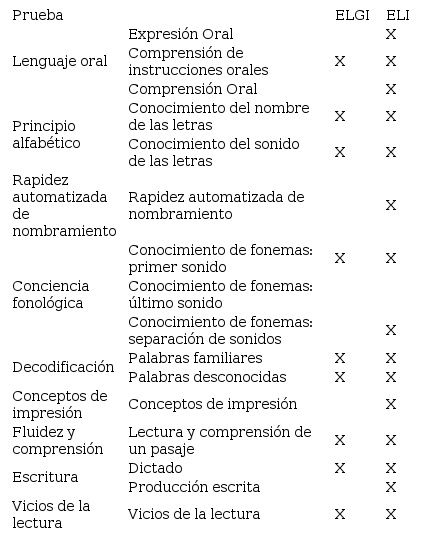 La versión de ELGI utilizada en esta investigación fue revisada en 2019 y dio paso a la Evaluación de Lectura Inicial [ELI]. Como se muestra en la Tabla 2, esta es una revisión mejorada y actualizada de la ELGI, que incluye nuevas pruebas, como expresión oral, comprensión oral, rapidez automatizada de nombramiento, conocimiento del último fonema, separación de sonidos y conceptos de impresión. Además, amplía la prueba de escritura con producción escrita (Quiñonez et al., 2017).