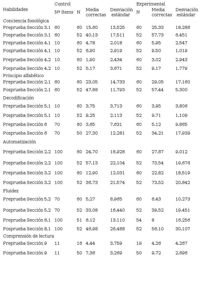 En general se demostró que, en la habilidad de conciencia fonológica, se logró un aumento del conocimiento del sonido de las letras, separación de fonemas e identificación del fonema inicial. El grupo experimental logró el 95 % de respuestas correctas en las tres secciones de ELGI, mientras que el control obtuvo el 66.88 % en conocimiento del sonido, el 69 % en fonema inicial y el 51.7 % en separación de sonidos. En el principio alfabético, ambos grupos mejoraron después del tratamiento. Sin embargo, en el grupo control, solo lograron identificar correctamente el 79 % de las letras del ejercicio; mientras que el grupo experimental, el 95 %. En la habilidad de decodificar, el grupo control obtuvo un 30 % de respuestas correctas; mientras que el experimental, el 48.87 %. Esto denota mejoría, en contraste con los resultados de la preprueba.