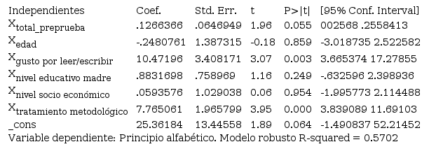 En cuanto al modelo de principio alfabético, la variancia explicada de los resultados obtenidos en la posprueba fue del 57.02 % (R-squared), y entre las variables que contribuyeron a explicar los resultados, están el gusto por leer y pertenecer al grupo experimental. De manera que, al controlar el efecto de todas las variables, el grupo experimental obtuvo en promedio 7.76 más respuestas correctas en comparación con quienes estuvieron en el grupo control y, si un estudiante respondió que le gustaba leer, logró en promedio 10.47 más respuestas correctas en esta habilidad (ver Tabla 6).