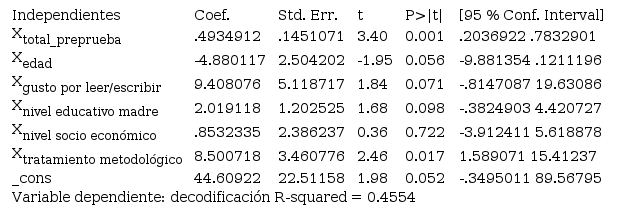 En el modelo para decodificación, el 45.54 % de la varianza (R-squared) en los resultados de la posprueba fue explicada por los predictores, donde resultaron significativas la preprueba y pertenecer al grupo experimental; por lo tanto, al controlar el efecto de todas las variables, por cada medio punto de variación en la preprueba, aumentó una unidad en la posprueba. Además, quien perteneció al grupo experimental, obtuvo en promedio 8.5 respuestas correctas más que el control en las subpruebas de decodificación (ver Tabla 7).