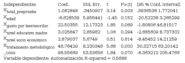 En el modelo de automatización, la varianza explicada fue del 56.88 % (R-squared), donde el tamaño de efecto de la intervención fue el más alto de todas las habilidades de lectura. En el caso de este modelo, al controlar el efecto en todas las variables, el resultado en la preprueba y pertenecer al grupo experimental fueron las variables que se asociaron significativamente al desarrollo de la automatización. Esto significa que por cada punto que varía la preprueba, en promedio, el estudiantado tendió a obtener una respuesta correcta en la posprueba; mientras que quienes estuvieron en el grupo experimental lograron una media de 46.36 respuestas correctas más que el control (ver Tabla 8).