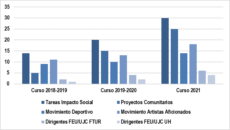 A pesar de que los logros obtenidos entre el año 2015 y 2021 son relevantes: más de 20 Premios al Mérito Científico[2], Premios Relevantes, Destacados, Mención en eventos desde el nivel de base hasta en eventos internacionales, 3 Premios del Ministerio de Ciencia, Tecnología y Medio Ambiente a Estudiantes Investigadores, así como la declaración de estudiantes integrales en las esferas de docencia e investigación por la FEU de la Universidad de La Habana y de la FEU de Cuba, las personas autoras concuerdan con Franco et al. (2022) al sentenciar que: “este trabajo carece de sistematicidad y de un enfoque sistémico. Demandando de una visión estratégica que permita vislumbrar las necesidades de investigación en el turismo” (p. 5).