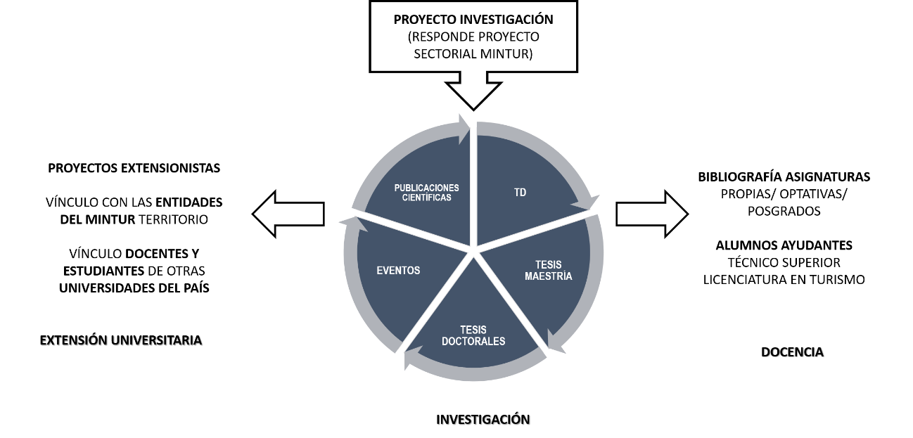 Con base en la planificación de dicho proyecto se diseñaron investigaciones para estudiantes que en un corto plazo (1-2 años) tengan como salida sus Trabajos de Diplomas (TD). A su vez, se diseñaron proyectos para docentes más jóvenes donde los TD tributen a investigaciones que puedan ser presentadas como proyectos para optar por el título de Máster en Gestión Turística. La cúspide de esta proyección culmina con la posibilidad de realizar dos tesis doctorales en igual período de tiempo.