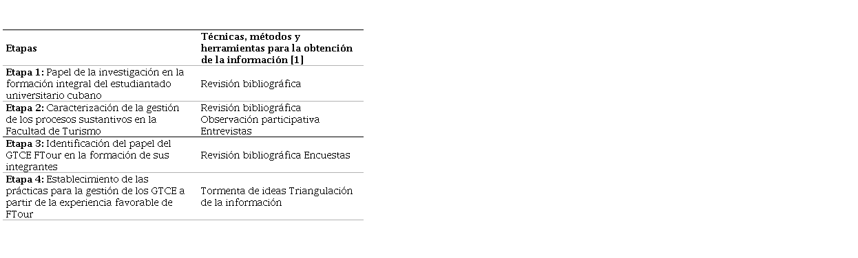 Para la obtención de la información en las etapas 2 y 3, la autoría realizó encuestas al 100 % de las personas activas del grupo (35 estudiantes), teniendo en cuenta que, si se seleccionaba una población muestral menor, los resultados carecían de representatividad. Por su parte, las entrevistas fueron realizadas a personas egresadas de la Licenciatura en Turismo que, durante los cursos en cuestión formaban parte de GTCE, así como a actantes clave del proceso de investigación en la Facultad y en la propia Universidad de La Habana.