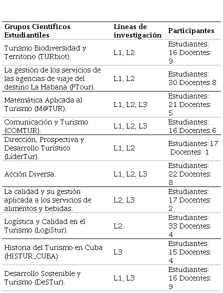 De acuerdo con lo anterior, las personas autoras afirman que las estructuras mencionadas integran a un número mayor de estudiantes y docentes en las tareas de investigación. Además, según la opinión de Hernández et al. (2021), logran establecer un vínculo inquebrantable con los otros procesos sustantivos de la educación superior: docencia y extensión universitaria. A partir de lo expresado, el artículo pretende ejemplificar el papel de la investigación en la formación integral del estudiantado universitario tomando como estudio de caso el papel de uno de los GCE de la Facultad de Turismo de la Universidad de La Habana: FTour.