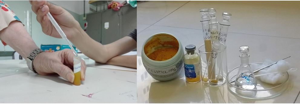 A fin de fomentar la atención del alumnado, se seleccionaron y relacionaron conocimientos de materiales de interés alimentario cotidiano y potencialmente terapéutico. Se partió de la cúrcuma −una especia que reúne las dos categorías mencionadas− y se la comparó con un compuesto aislado de una planta local, clasificado en la segunda. Anteriormente se habían seleccionado materiales que tienen uso alimentario y son además fuentes de potenciales medicamentos. Entre ellos, las cáscaras de naranja dulce, cacao, té, algarrobo, granos de cereales, condimentos, etc. (Pérez et al., 2003a, 2003b; 2005; 2008; 2013).