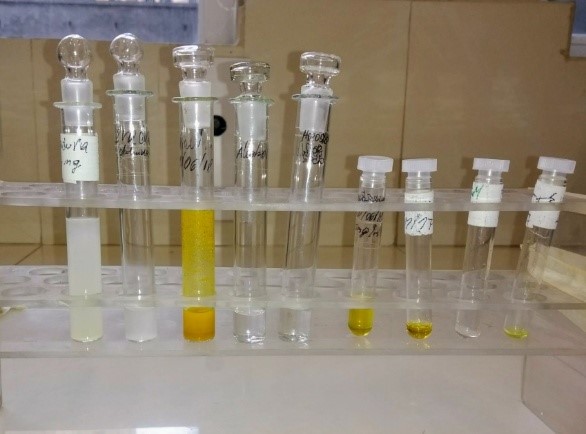 Cúrcuma: 6 mg de cúrcuma por ml de agua destilada (además de carecer de sustancias que puedan interferir en los métodos de laboratorio utilizados, imita el uso alimentario común) y 6 mg por ml de la mezcla de solventes DMSO/agua destilada (1+ 5) vol.