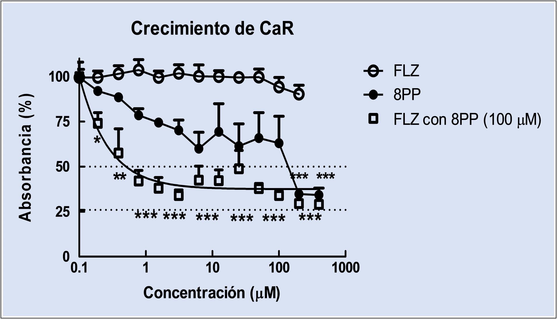 En la Figura 6 se muestran datos de experimentos realizados en la UBA y publicados en 2012. En la ordenada se representa la absorbancia como medida del crecimiento de Candida albicans y en la abscisa la concentración de fluconazol, 8PP o su combinación, según lo especificado por sus símbolos. Se observa que el fluconazol no produce cambios significativos en el crecimiento de Candida albicans (porque esta es resistente al fluconazol). En cambio, a las mismas concentraciones el 8PP inhibe el crecimiento y la combinación de fluconazol con una concentración constante de 8PP produce un efecto mayor que la del fluconazol solo. Esto demuestra una cooperación del 8PP con el fluconazol.